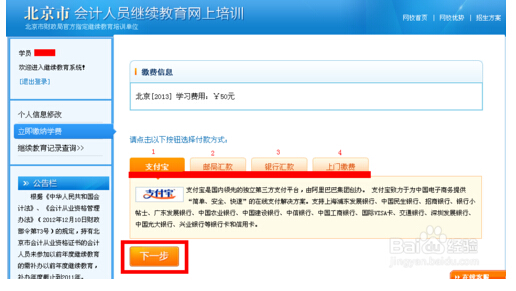 2 鼠标单击“登陆”,弹出如下图页面,选择“学习类型”里面的“北京【2013】”,学费50元。